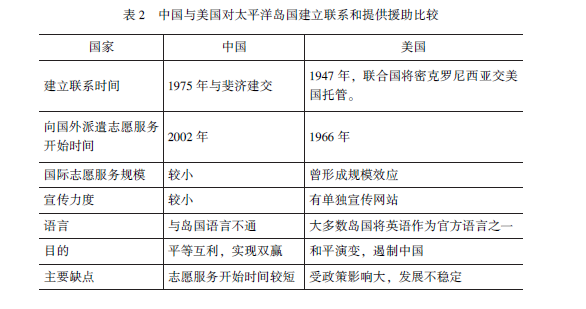 自2002 年以来, 我国向太平洋岛国提供志愿服务, 为这些国家在教育、 医疗、农业等领域的发展提供重要支持。例如, 我国在太平洋岛国兴办 “孔子学院”, 向岛国派出“和平方舟” 号医疗船、派遣农业技术专家。但 与美国和平队在太平洋岛国的活动相比, 我国与太平洋岛国正式建立联系 的时间较晚, 派出的志愿者规模较小, 国际志愿者专门网站还未形成, 与 岛国的语言交流也存在一定障碍(见表2)。
